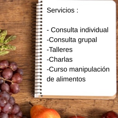 Se ofrece consuta individual y grupal para niños, adolescentes, adultos y adultos mayores, tratamiento de diferentes patologías, educación nutricional, elaboración de menús y estandarización de recetas